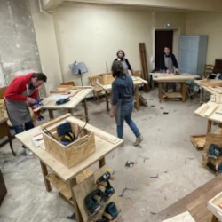 L’atelier se déplacera en fonction du besoin. Équipé de 6 établis et de tous le matériels nécessaires, les outils manuels (scies, marteaux, serre-joints ou encore ciseaux à bois)mais aussi les machines (scies sauteuses, scies circulaires, visseuses/perceuses et ponceuses) ainsi que la quincaillerie et les chutes de bois nécessaires. Il suffira alors d’une salle, d’un hangar, d’un garage ou d’un espace vert les jours de beau temps pour que l’atelier prenne vie. Ainsi, l’atelier vient à vous ! Les différentes villes étape sont indiquées dans les réservations.